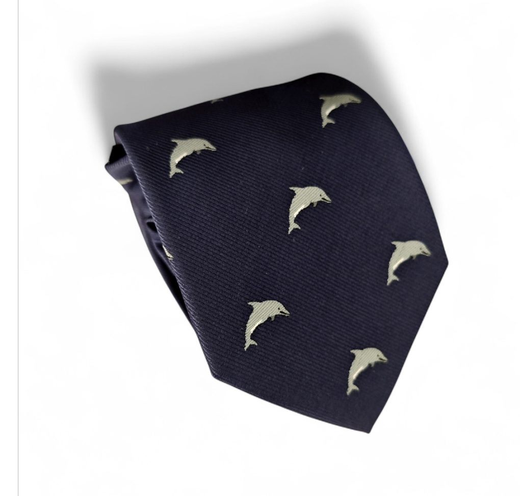 Corbata azul marino tejida delfines grises un accesorio distinto, con mucha onda y personalidad.