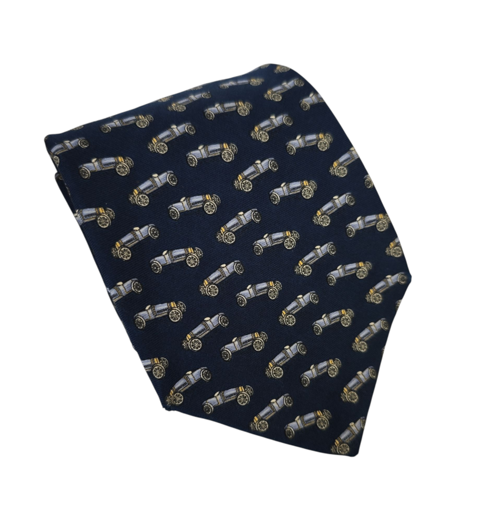 Corbata Vintage Reciclada 100% seda, corbatas rescatadas en desuso – Pala Ancha 9,5 cm con autitos antiguos, marca original Brooks Brothers.