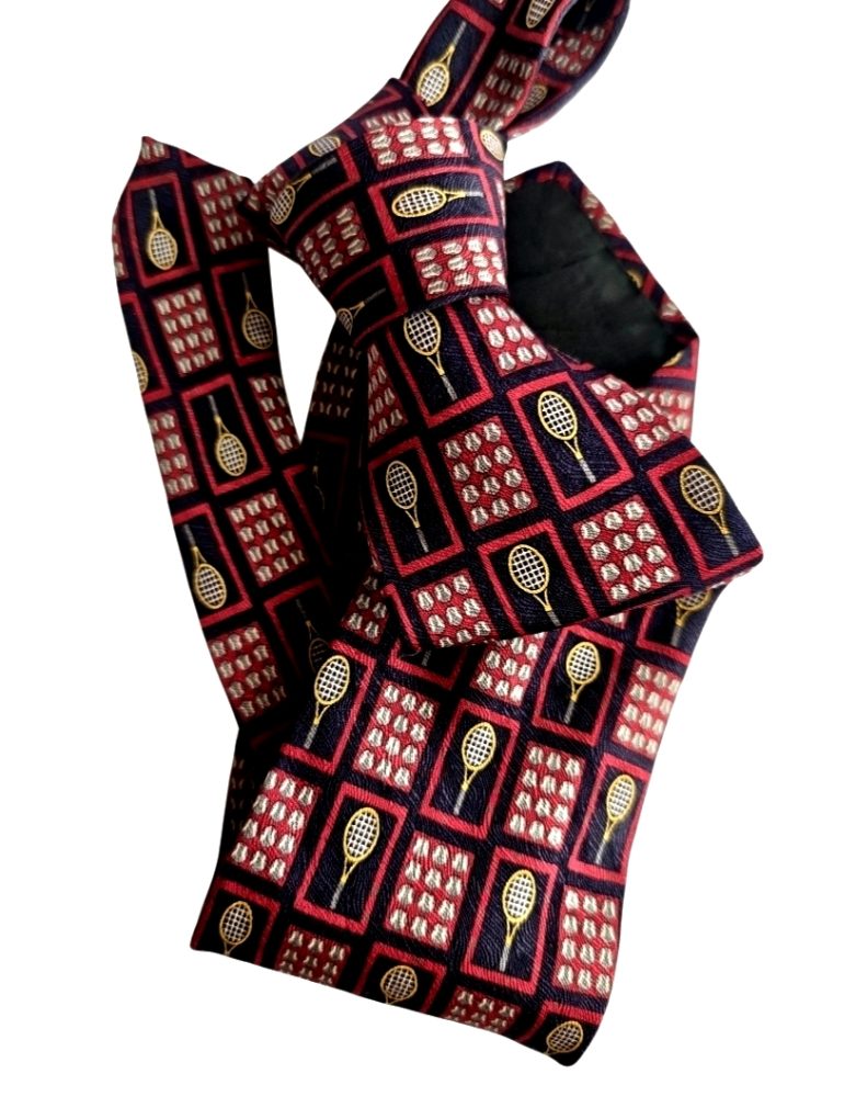 Corbata Vintage Reciclada 100% seda, corbatas rescatadas en desuso – Pala ancha 8cm estampado clásico de raquetas de tenis y pelotas.